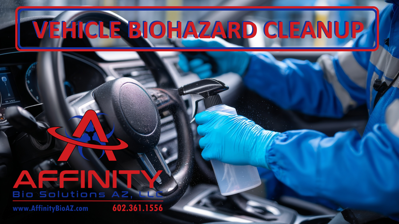 Hidden biohazards don’t always look obvious. If a vehicle was involved in an accident or traumatic incident, contaminants like blood and bodily fluids can soak into upholstery, padding, seams, and vents. Professional remediation is essential. This includes understanding what disclosure & documentation should look like, as well as the buyer checklist that keeps you safe. Affinity Bio Solutions specializes in vehicle biohazard cleaning and remediation across Arizona. Professional, discreet, and fully documented for buyers, sellers, insurers, and fleets.